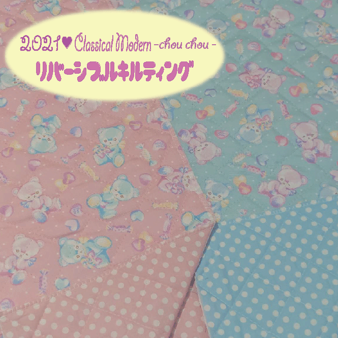 大人気クラシカルモダンシリーズからリバーシブルキルティング生地が登場! キャンディをもったくまさんがいっぱい♡ あま〜いお菓子がいっぱいでワクワクしますね♪